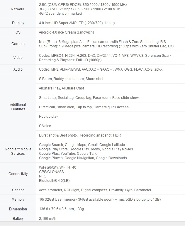 Here’s a full look at the Samsung Galaxy S III’s specs: