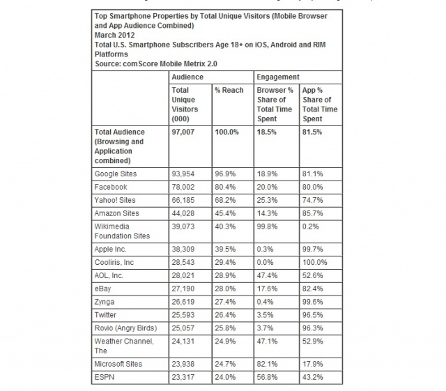 Interestingly enough, both apps and the mobile browser shared about the same sized audience, yet apps accounted for 4 out of every 5 mobile media minutes. Among the top properties, Google Sites ranked at the top with nearly 94 million unique visitors, representing 96.9 percent of the mobile audience. Facebook ranked second with 78.0 million visitors (80.4 percent reach), followed by Yahoo! Sites with 66.2 million visitors (68.2 percent reach) and Amazon Sites 44.0 million visitors (45.4 percent reach).