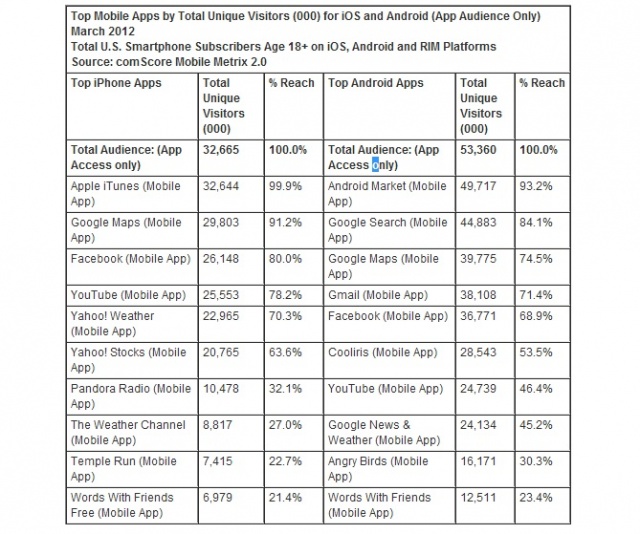 Top apps among Android and iOS varied a bit with the top apps of course being iTunes and the Google Play Store. After that it’s a mixed bag of Google services, games and the popular social networking site Facebook.