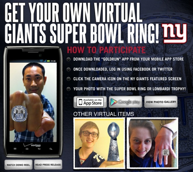 Augmented reality allows computer generated content to be superimposed and viewed live in a real world environment. To celebrate the unveiling of their Super Bowl XLVI championship ring, the New York Giants are inviting fans to share in the moment by using an augmented reality app on their Android or iOS device to virtually “try on” and take photos with the newly revealed Tiffany & Co.-designed ring. Fans can then upload their photos to Facebook, Twitter or by Email for a chance to have their photos showcased on Giants.com and Facebook.com/NewYorkGiants.