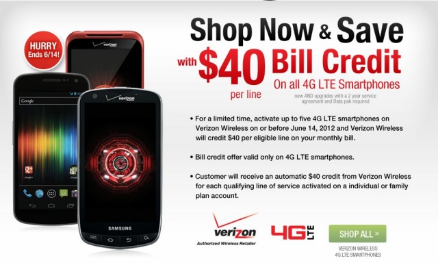 Wirefly, my other favorite mobile retailer, has a nice offer for anyone looking to pick up a Verizon 4G LTE smartphone. Now through June 14, anyone who upgrades or activates a Verizon 4G LTE smartphone through Wirefly will receive a $40 bill credit. You can activate and receive the discount on up to five 4G LTE devices for each qualifying line.