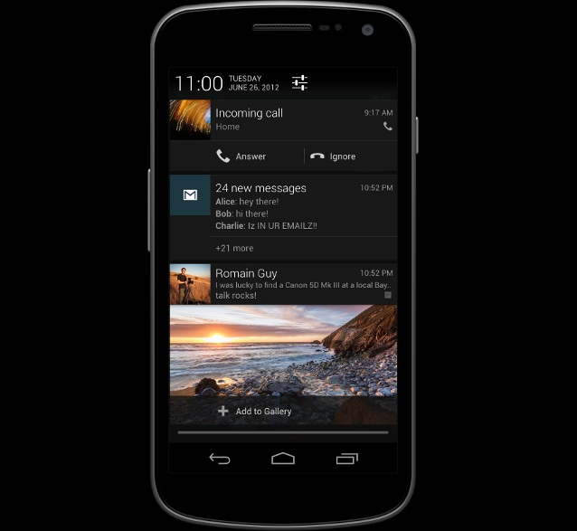 In Android 4.1, notifications have received a nice overhaul, making them larger, more informative, and interactive. In Android 4.1, there are various new types of notification content which can be expanded or collapsed with a pinch. You can also configure priority, and even perform multiple new actions.