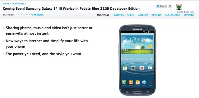 Samsung Now Listing Verizon Samsung Galaxy III Developer Edition As “Coming Soon”