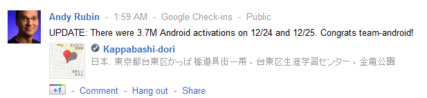 We’ve already heard about the record breaking Android and iOS device activations on Christmas day, but how many of those were Android devices? According to a few social media posts made by Andy Rubin, that number is — 3.7 million! Assuming that number is correct (and I’m sure it is), that would mean that of the total 6.8 million devices activated on Christmas day, 3.7 million of them were Android devices. That leaves us with 3.1 million iOS devices also activated on Christmas day, leaving Android and iOS considerably close, in terms of holiday activations. These are certainly numbers that both companies should be proud of.