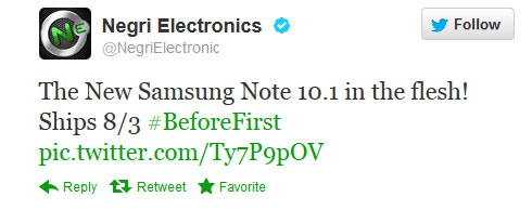 Yesterday, U.S. electronics retailer, Negri Electronics, tweeted a picture of a freshly unboxed Samsung Galaxy Note 10.1 with the message “Ships 8/3 #BeforeFirst.” The message wasn’t very specific and sent confused Android fans clamoring about looking for answers. A venture over to the Negri site reveals they, in fact, have the yet to be officially announced Galaxy Note 10.1 up for pre-order. Unlike their tweet, the site makes no mention of the August 3rd shipping date.