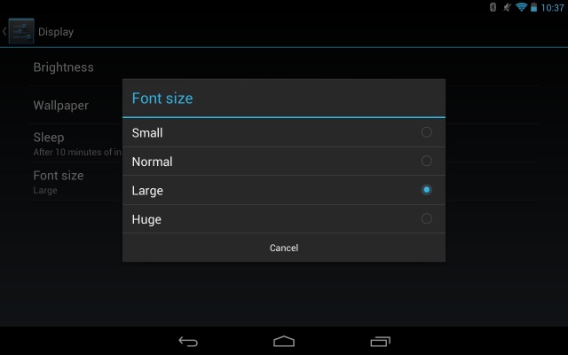 If you’re like me, your eyes aren’t what they used to be, and therefore you might find the font size on the Nexus 7 to be a tad tiny. Lucky for us, there’s a setting to fix that. If at any point you find the font size on your device to be too small or too big, you can head on into Settings > Display > Font size and pick from Small, Normal, Large, or Huge. Now this won’t affect every bit of text you see, so if you’re in an app that has small text, you can always try checking to see if they have their own settings.