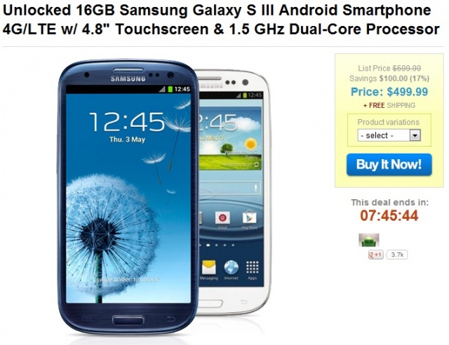 Next up, you’ll find an unlocked AT&T Samsung Galaxy S III from 1saleaday.com for only $500. That’s even less than what Amazon Wireless is selling it for. The only catch: the deal ends in about 7 hours.