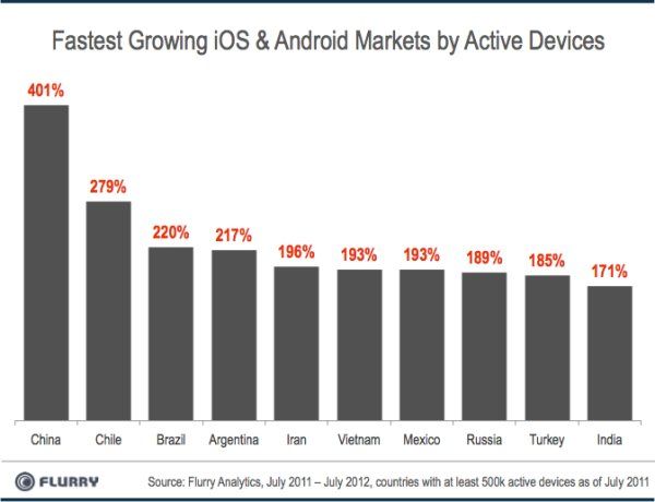 Overall, Flurry estimates that there were over 640million iOS and Android devices in use across the globe during the month of July 2012. The report also reveals that the U.S. has the greatest number of active smartphones with 165 million, but China is hot on their heels with 128million and they’re growing by 401% year over year.