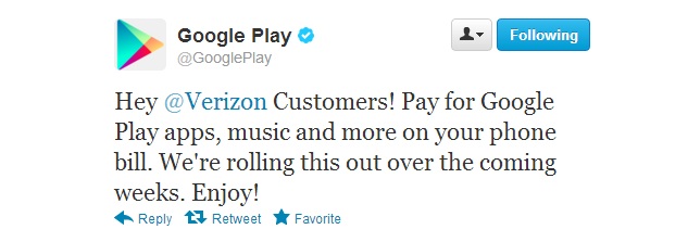 Two days ago we told you about Verizon’s plan to allow carrier billing for up to $25 worth of digital content a month from the Play Store. Today was the day it was supposed to go live and while it hasn’t, Google has taken to the Play Twitter account to confirm that it is indeed on the way.