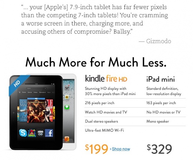 If you head over to https://www.amazon.com/ today, you’ll find the Gizmodo quote at the top of the page, along with a large ad displaying the shortcomings of the iPad Mini in comparison to the Kindle Fire HD.