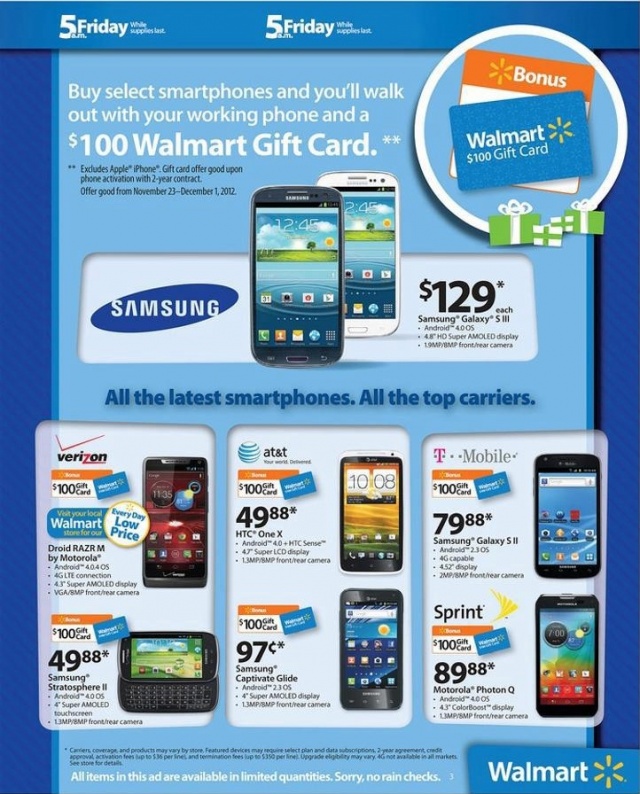 Along with a few decent deals, Walmart will be offering up a $100 gift card when you purchase one of the following Android smartphones on Black Friday: