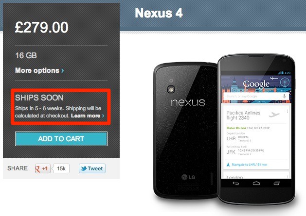 When the Nexus 4 initially returned to Google Play, there was a 1-2 week shipping delay, TechRadar reports. But it didn’t take long for it to change to 4-5 weeks, and then again to 5-6 weeks.
