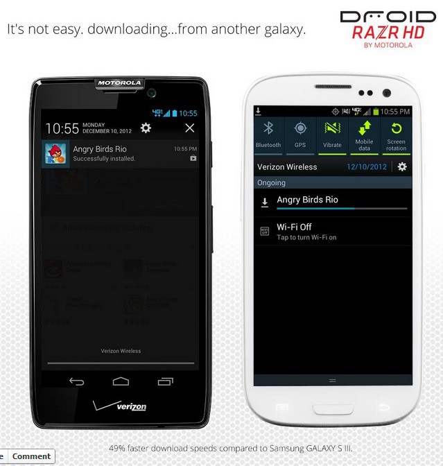 Motorola no longer has its sight solely on Apple as they’ve now turned their attack towards Android’s top dog Samsung. Motorola’s latest ad campaign pits the Motorola RAZR HD against the Samsung Galaxy S III, with a slogan of “It’s not easy. downloading… from another galaxy.” Motorola boasts an outrageous claim of 49% faster download speeds, which I find extremely difficult to believe considering the U.S. Samsung Galaxy S III has the same Qualcomm processor and modem as the RAZR HD — not to mention 1GB more RAM.