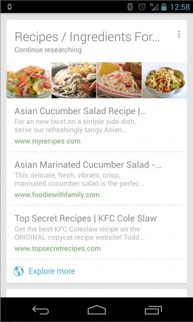 They’ll allow you to quickly “continue researching” recipes and ingredients for new meals, and suggest ideas based on the meals you’ve been searching for. They may not appear instantly after making recipe searches — I can’t get them to appear at all on my two Android devices, and Droid Life reports it took a day to show on theirs — but they’re certainly there, as you can see from the screenshot below.