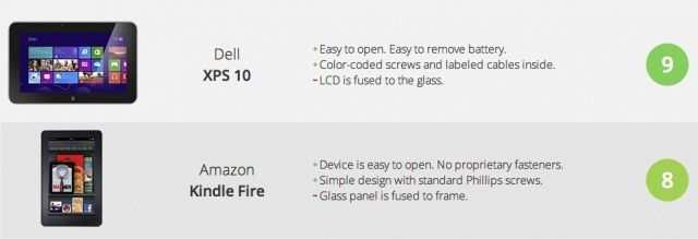 The Dell XPS 10 is determined the easiest tablet to repair, scoring nine points — more than any other tablet in the list. It’s closely followed by the original Kindle Fire, the Dell Streak, the Motorola Xoom, and the Samsung Galaxy Tab 2 7.0 — all of which scored eight points.