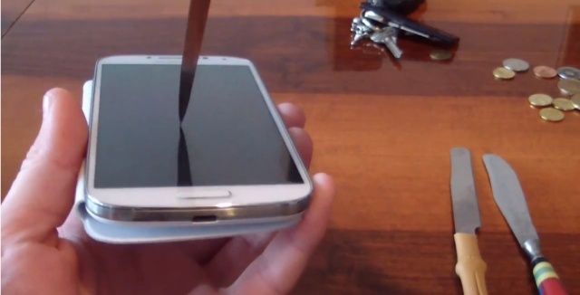 Admittedly the guy carrying out this test could have put a lot more effort into it, however; he’s clearly not using too much force, particularly with the knives. But nevertheless, it proves the Galaxy S4’s Gorilla Glass display is super tough, and that it won’t be damaged easily through everyday use.