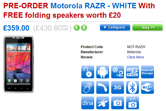 If you order the Motorola RAZR – White you’ll also be treated to a free set of Motorola MOTOROKR EQ3 Wired Compact Folding Speakers.