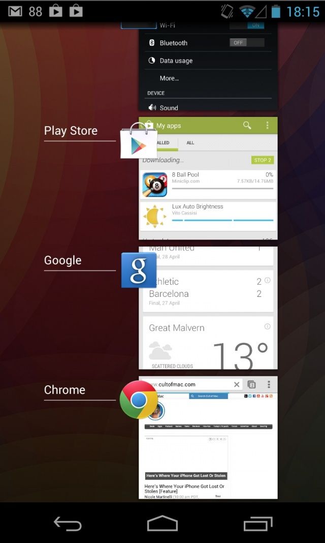 Multitasking was first introduced to iOS with iOS 4 back in 2010, and almost three years on, it hasn’t changed a bit — we still rely on a row of icons to jump between apps. In Android, however, users don’t just see an app’s icon, but also a preview of what’s going on inside their running apps.