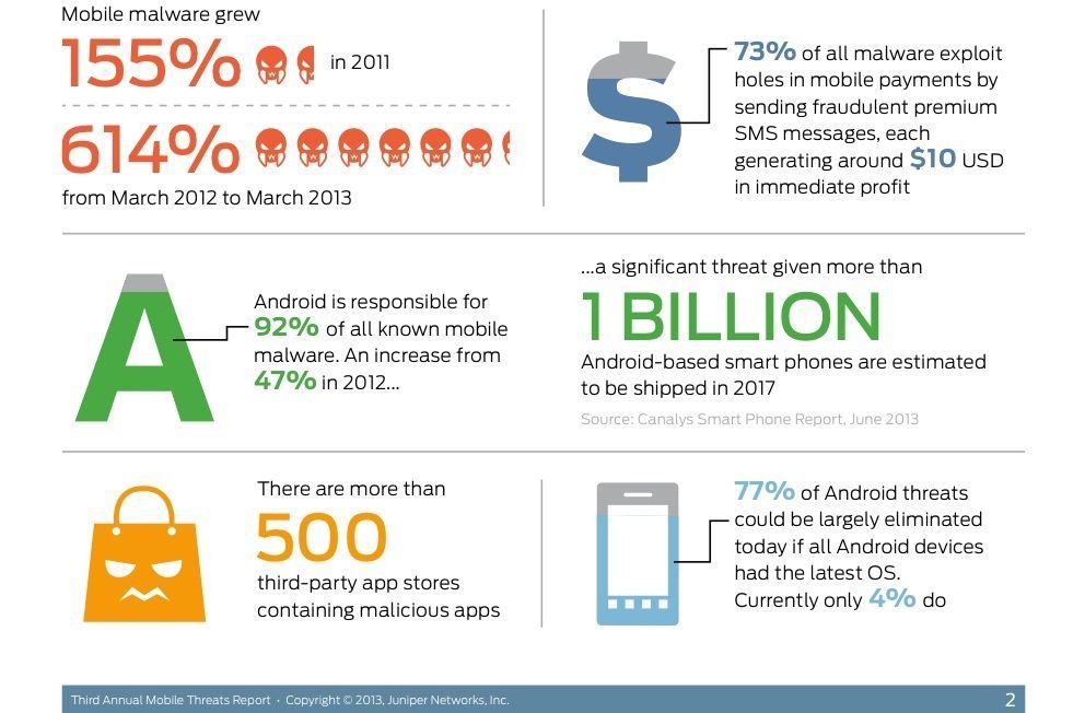 Between March of 2012 and March of this year, 2013, the Juniper Networks Mobile Threat Center (MTC) found a significant rise in the amount of mobile malware threats in the amount of 614 percent, making the total detected malware on mobile operating systems 276,259 incidences.