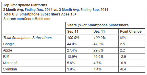 The latest comScore numbers are out and Samsung and Android continue to lead the pack. According to the three month average period ending December 2011, Samsung has held on as the top OEM with 25.3 percent of U.S. mobile subscribers. LG and Motorola took the number 2 and 3 spots, and even though Apple was in fourth, they were the only OEM to gain market share (up 2.2 points). As far as operating systems go, Google and Apple continue to be the only two gaining any ground.