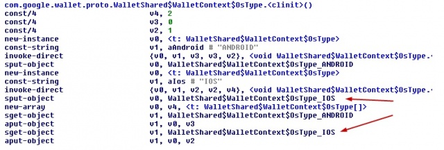 The first hints came within the “WalletShared” protocol buffers package which contained “IOS” values within the defining “DeviceContext -> HardwareType” field (you can see those in the image above). Later they found other hints within two additional protocol buffers called “IosDevice” and “IosWallet.” While the details were scarce, they call for information such as “appId”, “appVersion”, “walletUuid”, and a few “model” and “version” items.