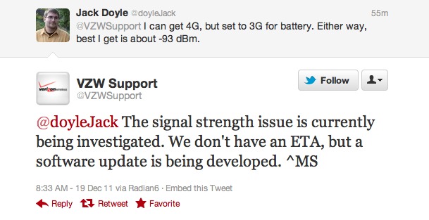 There’s been a lot of buzz going around about possible signal strength issues with Verizon’s LTE Galaxy Nexus. While I have yet to personally experience these issues, there seems to be enough people who have — enough so, that Verizon even tweeted about it. Today, VZW Support tweeted in response to a users questions about signal strength saying: