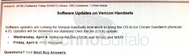 Owners of the Verizon Droid RAZR and Droid RAZR MAXX will be happy to hear that your device isn’t that far from officially being upgraded to Ice Cream Sandwich. While the upgrade was available through, unofficial, custom ROMs, it will officially be rolling out to those handsets April 4th, according to a spy shot of Best Buy’s internal systems. The HTC Rezound will be the following handset to be upgraded, on April 6th.
