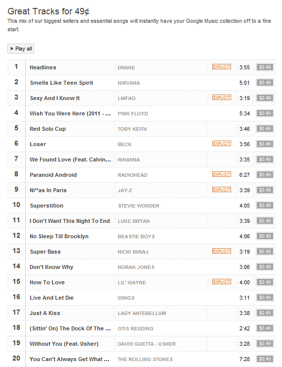 If you’ve been looking to get some great music at a ridiculous price, now’s the time. Google Music has kicked off their “Music Blowout Sale,” discounting over half a million albums to $4.99 and over ten million tracks for only $.49! Now that’s a deal worth listening to. I’ve already perused over a bunch of discounted tracks and I’ve found a plethora of alternative classics from Radiohead, Beck, and Nirvana.