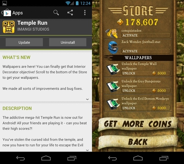 Temple Run has seen much success since being launched on Android and the developers have been doing a great job at keeping the app updated and fixing any bugs that arise. Today they released another update, this time not only squashing a few bugs, but also adding the much anticipated Temple Run wallpapers. It’s not so much the wallpapers we’re excited about but the fact that we can now move forward with completing the Interior Decorator objective we’ve been hung up on.