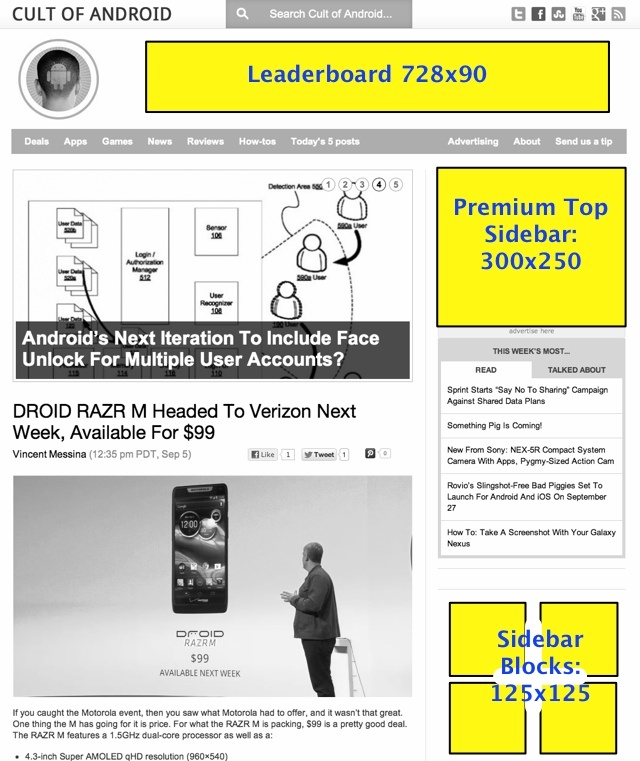 There are several ways to advertise on Cult of Android. For traditional display advertising, we offer IAB-standard sized units and discounted 125×125 spots through the self-serve widget embedded below.