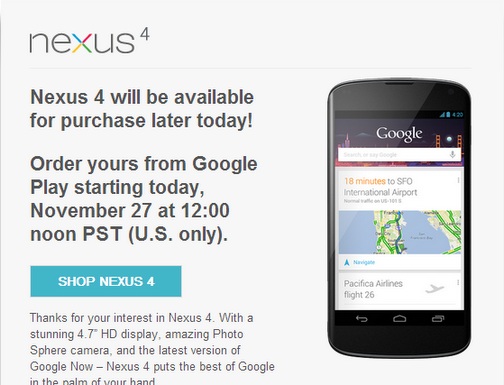 Google is sending out emails to let people know that at 12 noon PST, the Nexus 4 will once again be available for purchase via the Google Play store. This will certainly brighten the day for those of you who failed to hit your F5 key fast enough the first time.