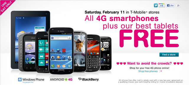 T-Mobile has announced its Valentine’s Day Sale promotion which will take place on Saturday February 11th. For one day only, T-Mobile will offer all of their 4G devices and select tablets for free. The promotion applies to anyone signing up for a new two-year contract on any qualifying Classic Plan™2 or for a $0.00 down payment after mail-in rebate card when signing up on a qualifying Unlimited Value™3 Plan.