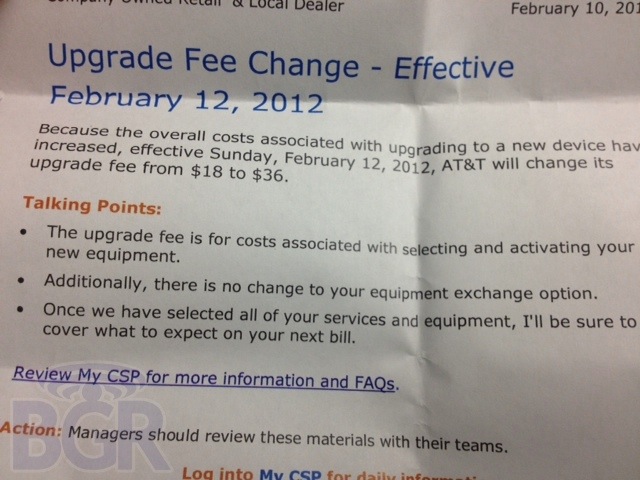 Starting Sunday AT&T customers will be faced with a $36 fee for upgrading to a new device. This is a 100% increase from the current fee of $18! You ask yourself why, why would AT&T impose a 100% increase on a fee so outlandish that the majority of carriers wave? I say it’s to make up for the 4 billion dollar loss they took on the failed T-Mobile merger. They say it’s because: