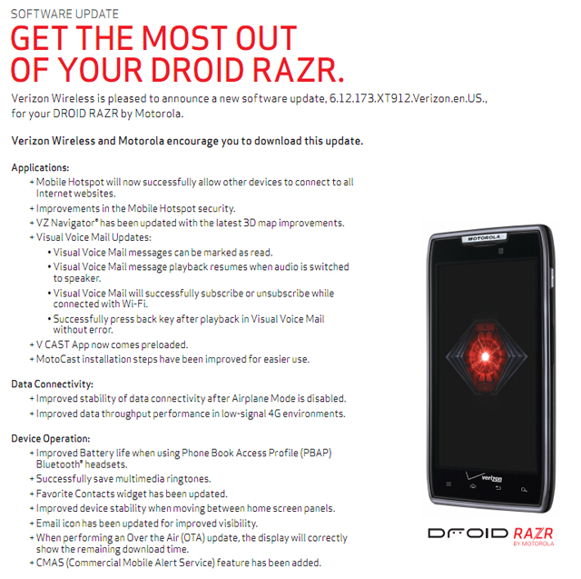 The DROID RAZR and the DROID RAZR MAXX are looking to get an update soon and unfortunately it’s not the one that brings Ice Cream Sandwich. However, it does bring quite a few improvements as you can see from the above image. If you can’t make out what’s new, here’s a nice list for you:
