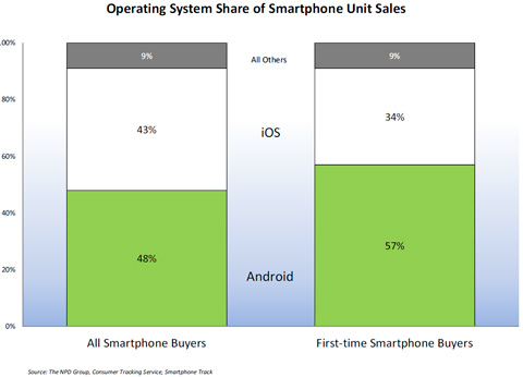 A study by The NPD Group, a leading market research company, provided us with some interesting Q4 statistics. On the obvious side of things, the number of smartphones sold in Q4 were up, with Android and iPhone accounting for over 90% of those sales. While you probably didn’t need a study to tell you that iOS and Android lead the smartphone market, I bet you weren’t aware that Android was actually a favorite among first time buyers.
