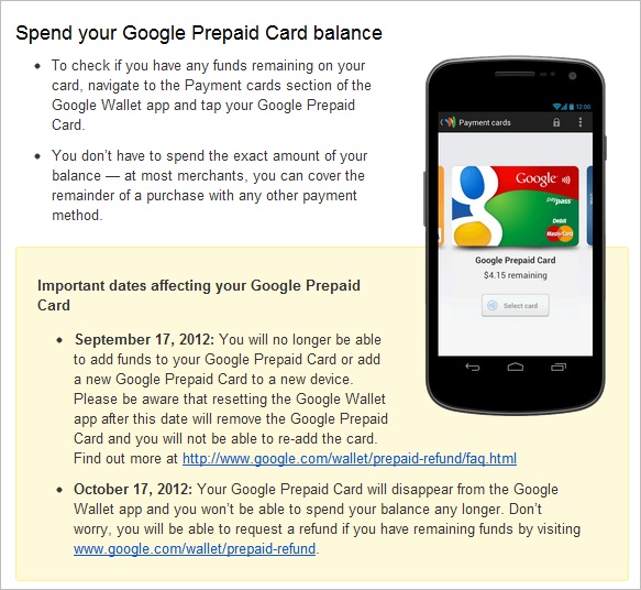 Google has begun sending out email to let Wallet users know that as of September 17, they will no long be able to add funds to their Google Wallet prepaid cards. In fact, by October 17, the Google prepaid cards will be discontinued altogether. That gives you a little over a month to either spend the remaining balance you have or request a refund.